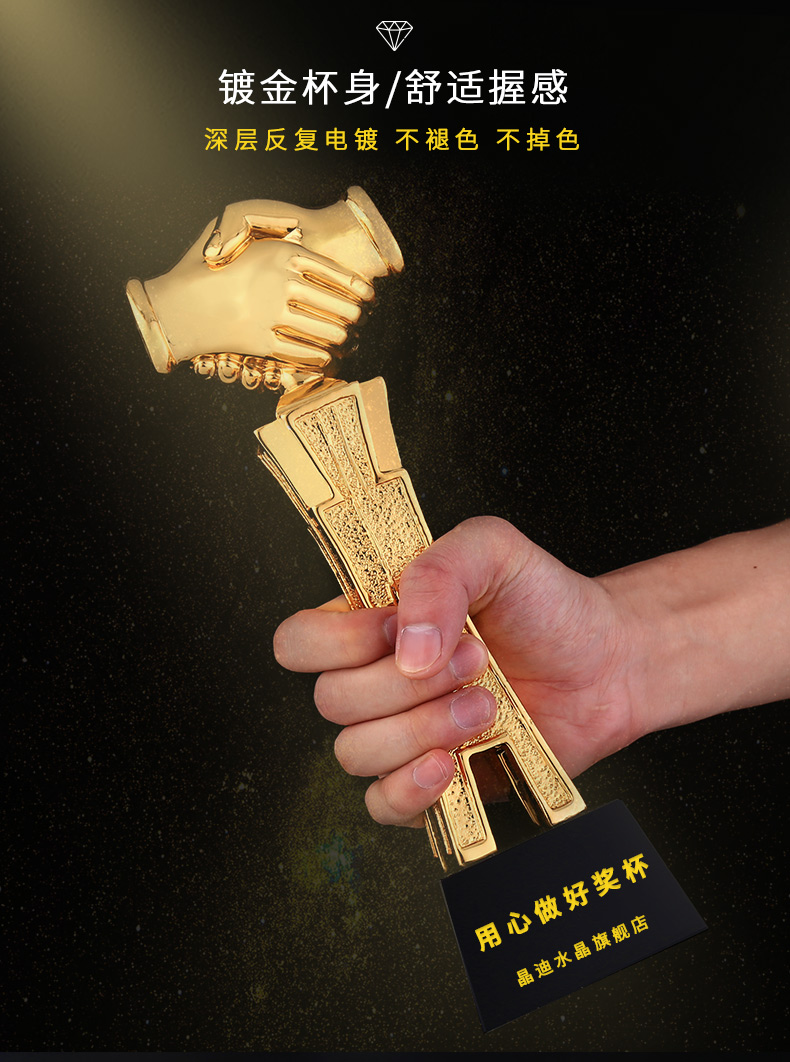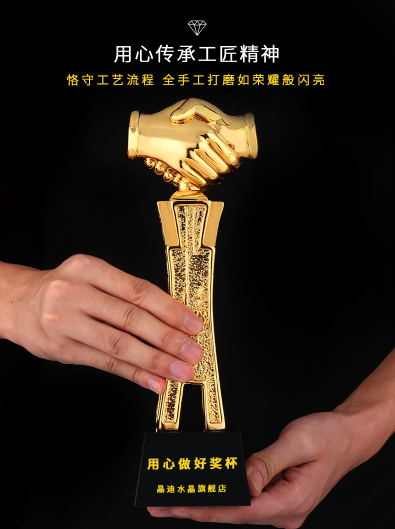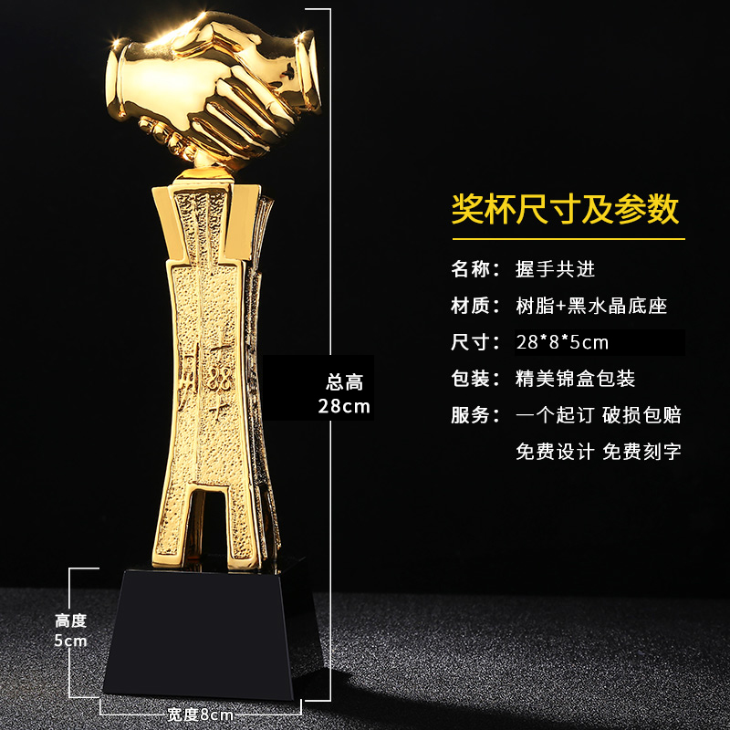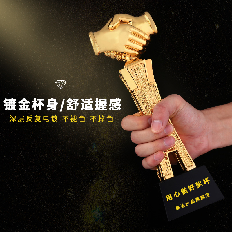 握手共进 镀金奖杯 创意奖杯专业定制 企业员工颁奖礼品订制