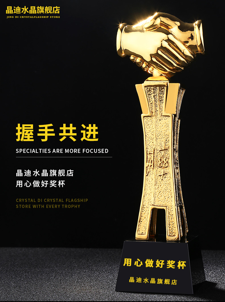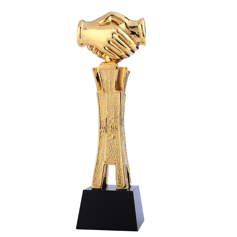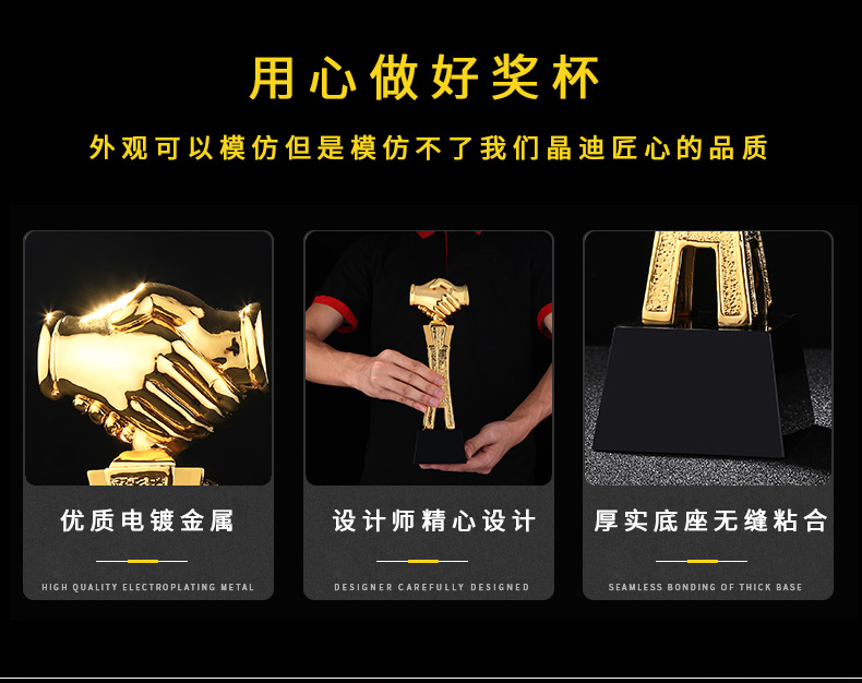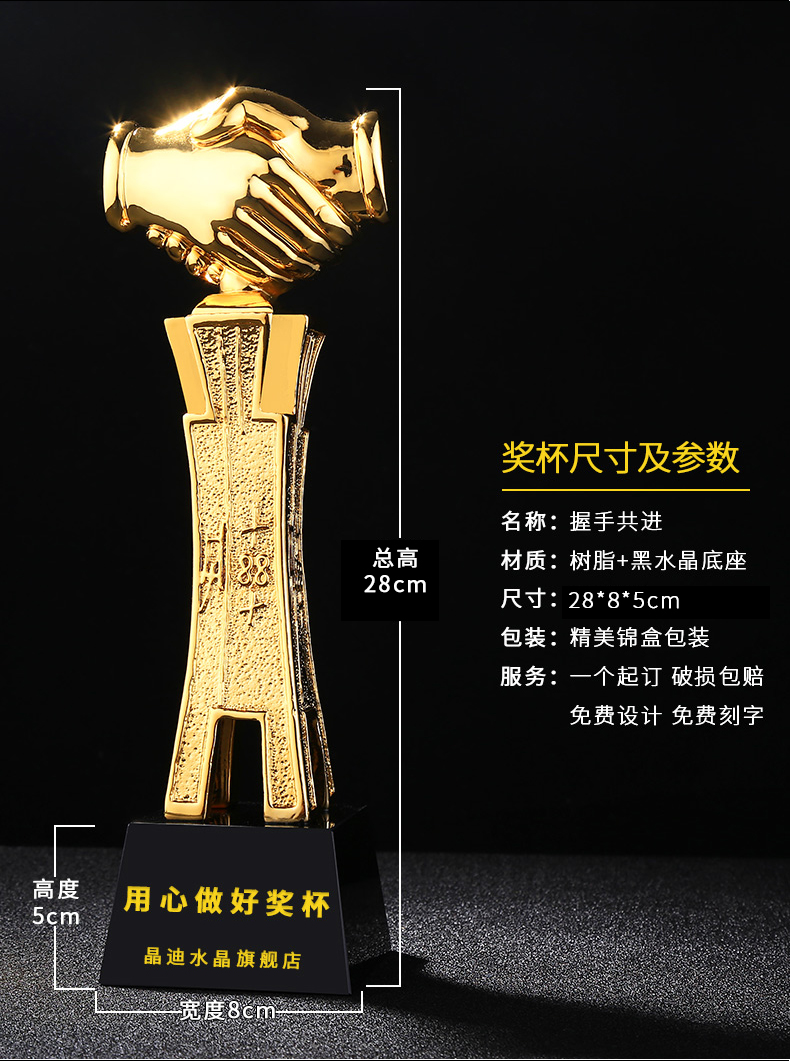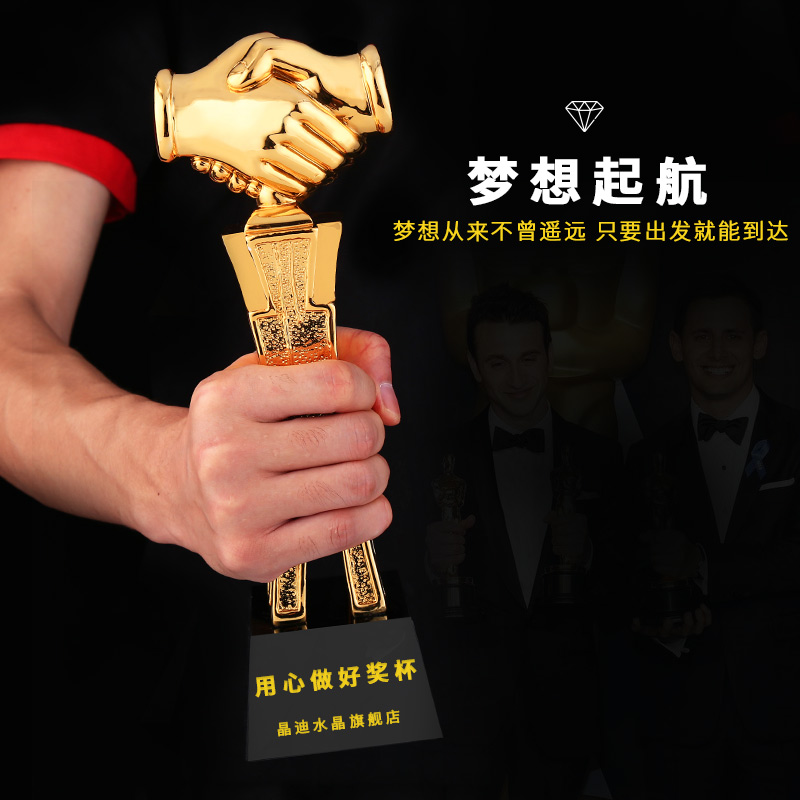 握手共进 镀金奖杯 创意奖杯专业定制 企业员工颁奖礼品订制